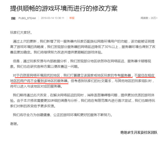 优化游戏环境蓝洞决定建立各区专有服务器